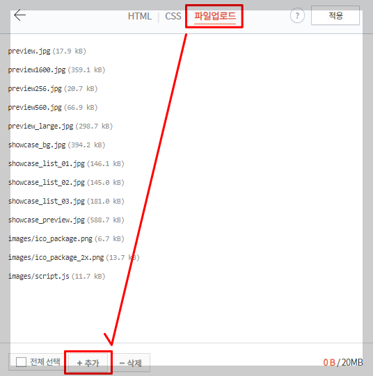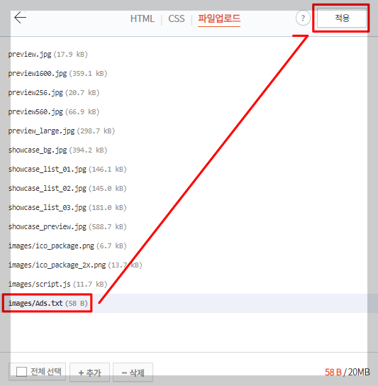 html 편집 메뉴로 들어오면 상단에 'HTML|CSS |파일업로드' 탭이 열리는데, 이 중 파일업로드 탭을 선택하고, 추가 버튼을 눌러 미리 만들어 놓은 Ads.txt 파일을 추가해준다. 파일이 정상적으로 추가되었다면, 목록에 images/Ads.txt 이 생성된다. 확인 후 적용 버튼을 눌러준다.