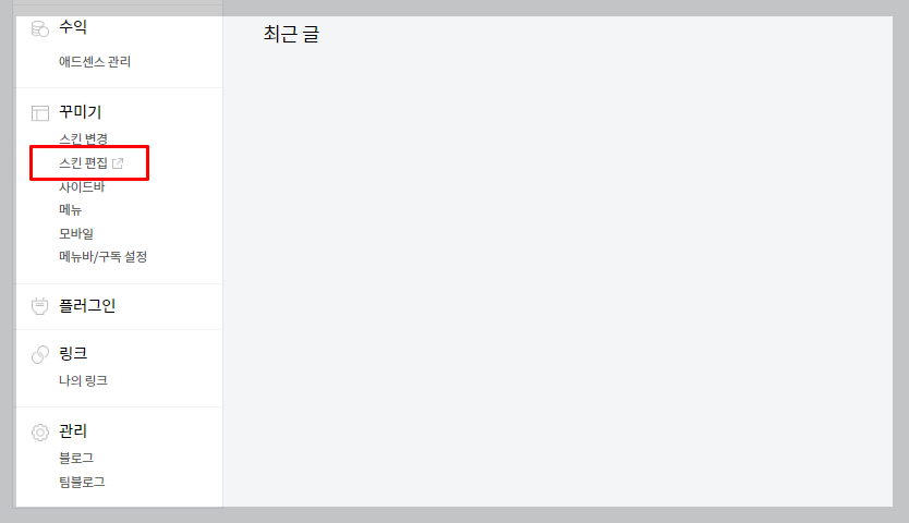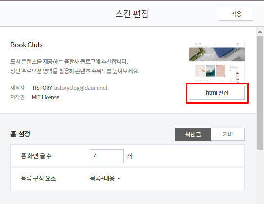 티스토리 관리 메뉴로 들어와 스크롤하여 내리면 꾸미기 - 스킨편집 메뉴가 보인다. 이 메뉴를 열어 html 편집을 클릭한다.