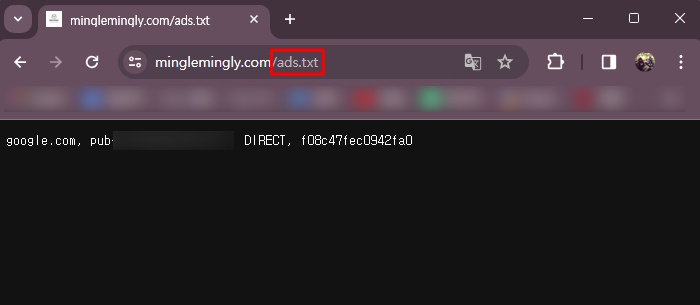 다만, 정상적으로 ads.txt 파일이 등록이 됐다면 주소창에 '티스토리주소/ads.txt' 를 입력하면 아래와 같이 ads.txt 파일을 확인할 수 있다.