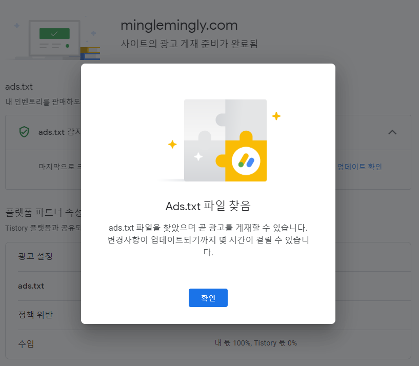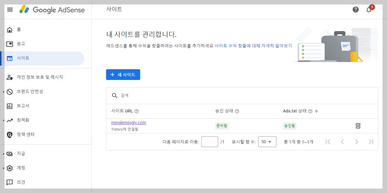 Ads.txt 파일을 확인한 뒤 다시 사이트를 확인해보니, 승인됨 상태로 변경되었다!